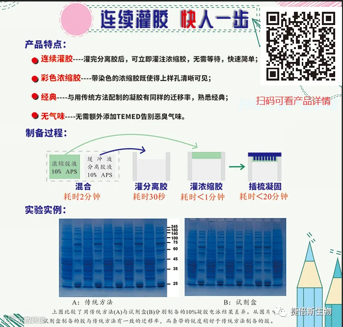 捷倍斯生物(GBCBIO)的 PAGE凝胶快速配制试剂盒-G3402N 配套提供 改良型促凝剂 ,其具有更好的稳定性和催化效能,配胶过程中无需额外添加 TEMED,采用上层胶和下层胶的预混配方,只需加入10% APS即可凝胶,简便快捷,而且有多种浓度比例可选择。