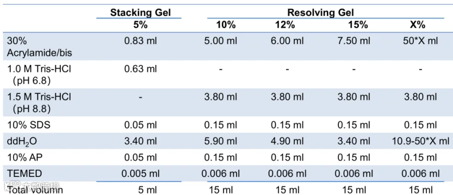 表中最后的 X% 是通用的计算公式,随 30%丙烯酰胺的量调整 ddH2O 的量。