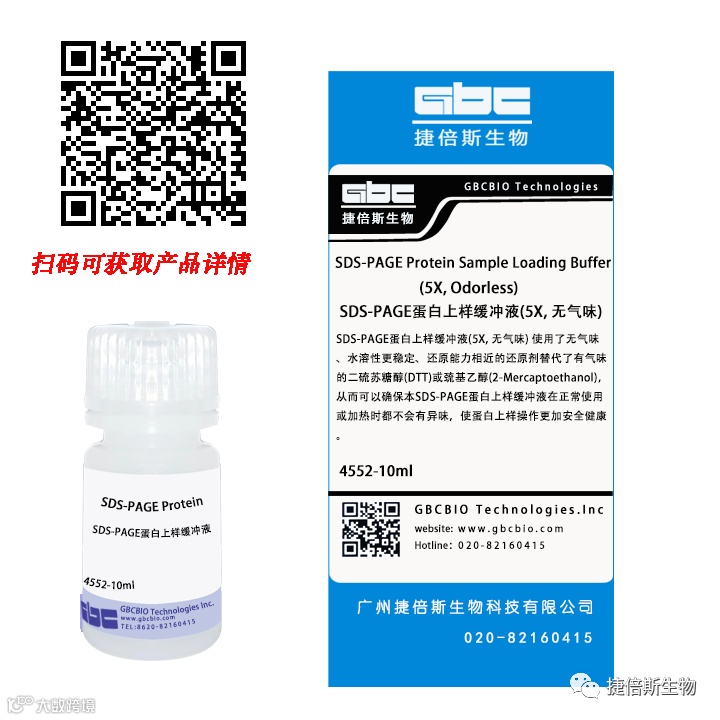 解决方案:捷倍斯生物(GBCBIO)的SDS-PAGE蛋白上样缓冲液(5X, 无气味)-4552使用了无气味、水溶性更稳定、还原能力相近的还原剂替代了有气味的二硫苏糖醇(DTT)或巯基乙醇(2-Mercaptoethanol),与常规的蛋白上样缓冲液的使用效果一致。
