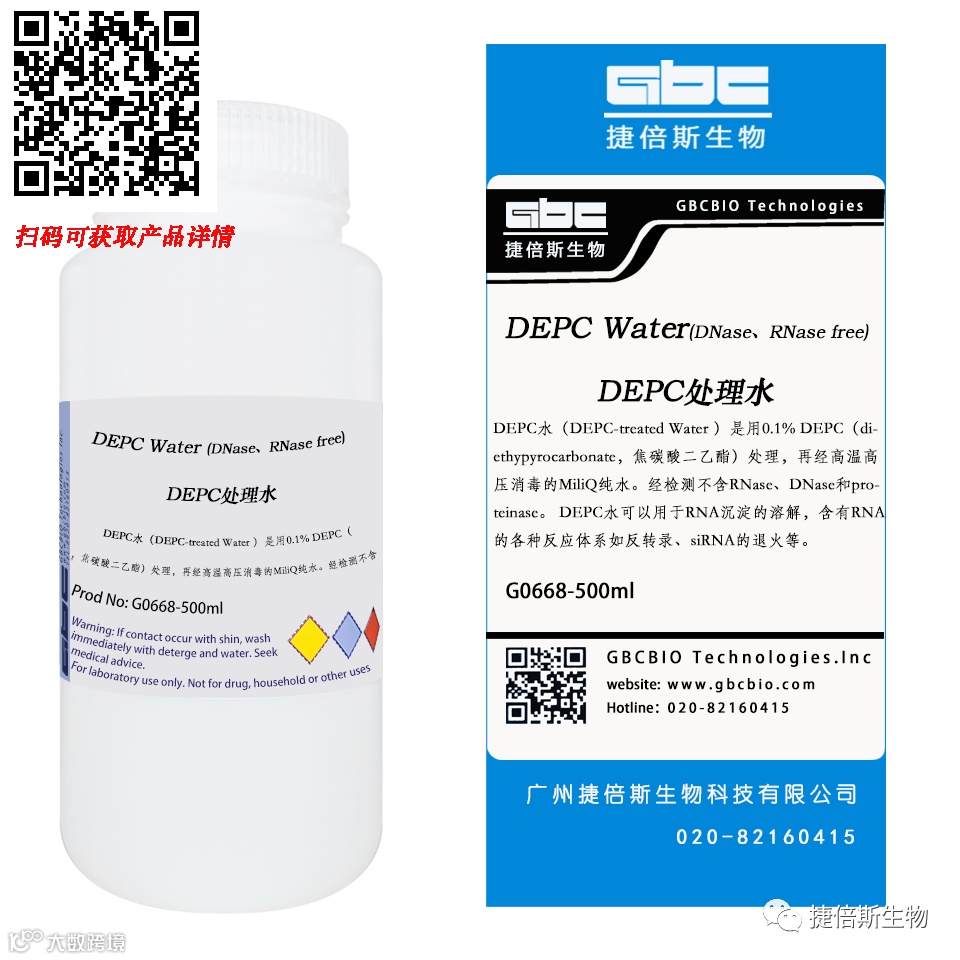 解决方案:使用捷倍斯生物(GBCBIO)的DEPC处理水-G0668 可避免吸入剧毒的DEPC原液。