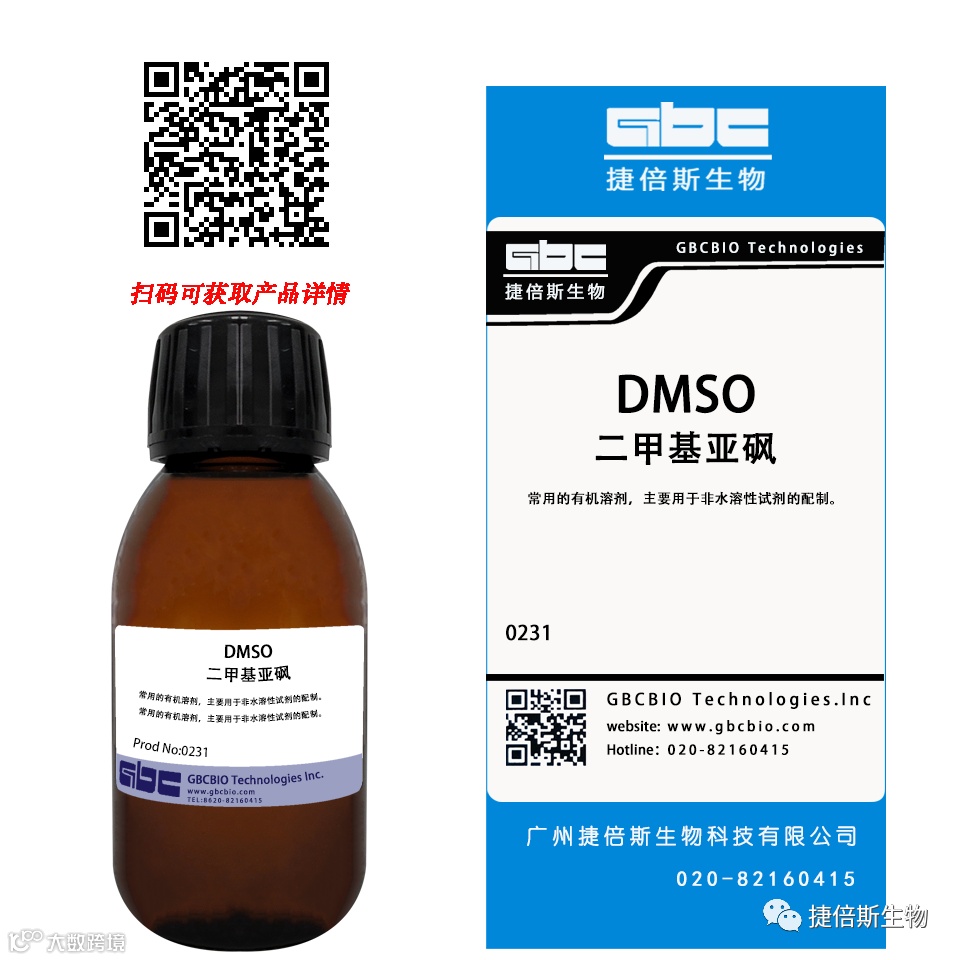 解决方案:捷倍斯生物(GBCBIO)的DMSO-D8418 是分子生物级别的产品可用于细胞冻存等分子生物实验。