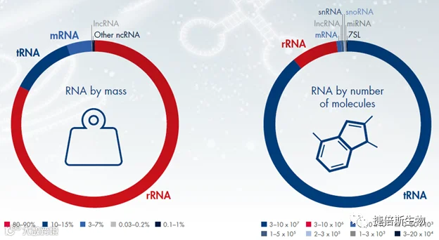 迄今为止,在活细胞中总共发现了至少14种RNA,典型的单个快速生长哺乳动物细胞中含有10–30pg总RNA,而完全分化的原代细胞RNA含量则更少,仅约含1pg。其中,最为大家熟知的RNA有mRNA、rRNA、tRNA以及其他非编码RNA如lncRNA、snoRNA、miRNA、siRNA和piRNA等。