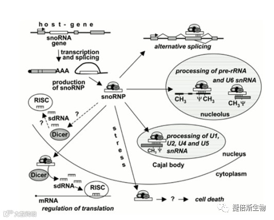 其中位于核仁内的snRNA称为核小体RNA(small uncleolar RNA),参与rRNA前体的加工及核糖体亚基的组装。