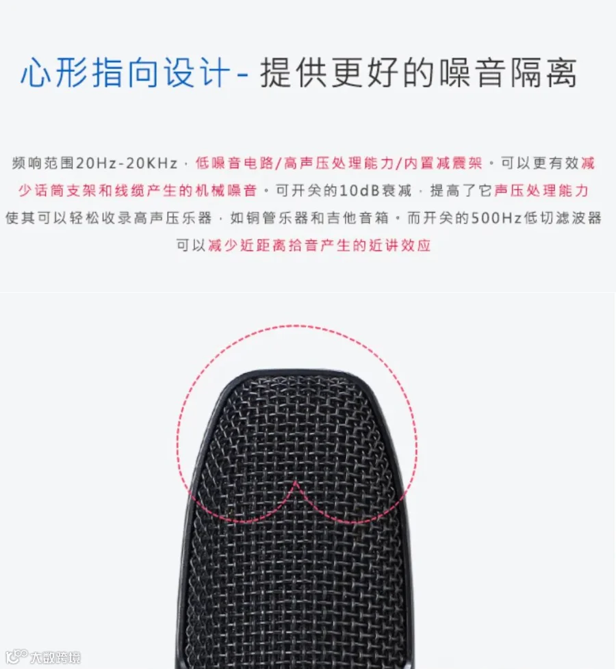 • 心形指向设计有效隔离环境噪音• 可切换10dB衰减垫,从容应对高音量乐器• 1英寸大振膜带来细腻温暖的声音细节