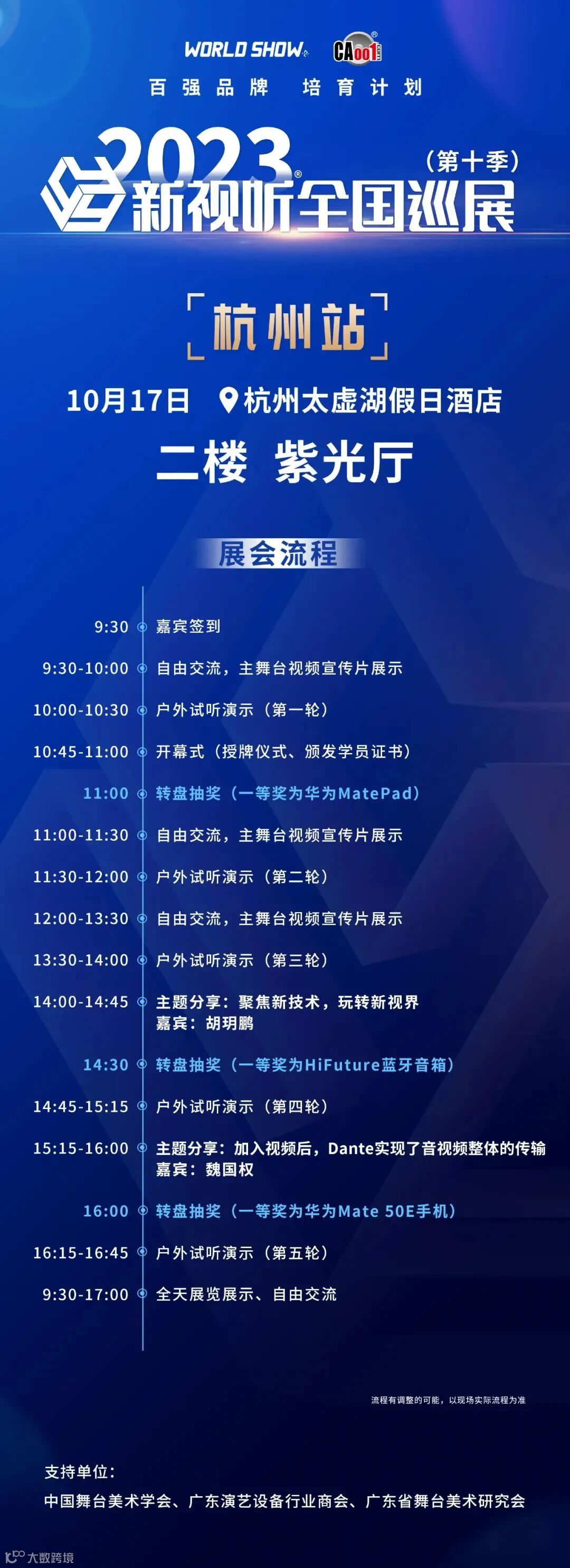 10月17日,2023年新视听全国巡展第十季第2站-杭州站于杭州太虚湖假日酒店顺利进行。本站定于福州凯宾斯基酒店。本季巡展,荣悦达星展出产品包括JBL EON700系列有源蓝牙扬声器、声艺 FX16II紧凑型调音台、XILICA Neutrino开放式媒体矩阵。