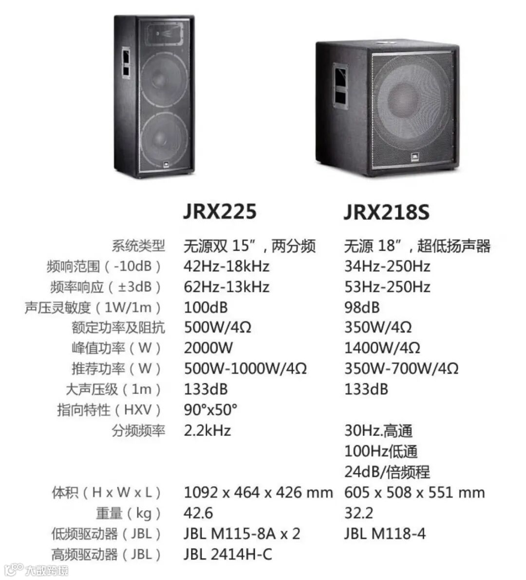 JRX212 (双12寸):中小场地人声清晰王(会议/演讲)。JRX215 (单15寸):全能多面手(演出/酒吧/多功能厅)。JRX225 (双15寸):大空间能量澎湃型(摇滚/电子/户外)。JRX218S (双18寸有源炮): 震撼低频核心,自带功放,让舞池跳动!