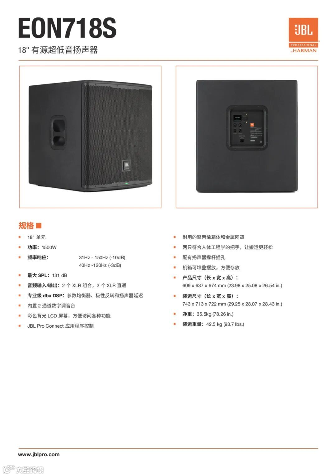 EON 700系列,包括10”的EON710,12”的EON712,15”的EON715蓝牙有源多用途扬声器和18”的EON718S超低音扬声器。得益于JBL升级定制的驱动器单元和号筒,带来高品质的声音和令人震撼的覆盖,由于响亮、清晰的声音,加上高达1300W(全频扬声器)或1500W(超低音扬声器)通透、高效的功率,使得该系统是各种中等规模的室内或室外活动的理想选择。