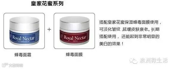 去黄、美白、修复、光滑、保湿,Royal Nectar皇家花蜜蜂毒面膜包含一个名Easyliance的成分,轻轻将刺激你的面部肌肉收紧和紧致肌肤,减少您的皱眉和笑声线的影响,有天然肉毒杆菌替代品之称。 具有强力抗氧化、抗老化、去皱,提升脸部线条面膜。【蜂毒面膜+蜂毒面霜=美肤效果提高30%】