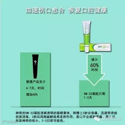 SM-33口腔软膏三步就可抑制牙龈肿痛,杀菌剂可防止肿胀牙周部位的感染,天然收敛剂可以镇静发炎的牙龈。减轻牙龈肿痛带来的痛苦。对遭受长牙痛苦的宝宝和智齿肿痛中的青少年来说也相当受用,这是唯一一款带有局部麻醉,有效抑制牙龈肿痛的牙齿软膏。