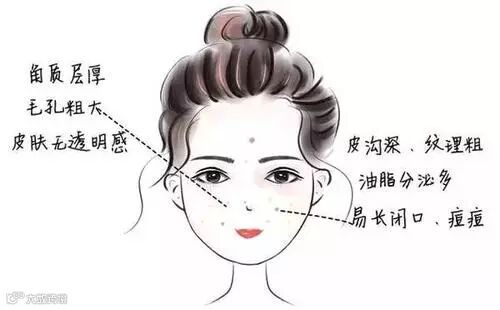 油性皮肤:鼻、前额、下巴、双颊、脖子中有四个地方出油。纸巾上留下大片油迹。