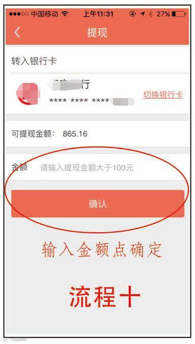 流程九:如绑定多储蓄卡请点击切换银行卡进行切换如只绑定一张,系统默认该卡,请输入提现金额-点击确认(如下图)