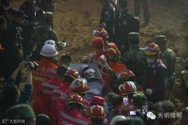 12月23日6时38分左右,深圳滑坡事故现场东二作业面成功救出1名男性幸存者。这名幸存者腿部受压,但头脑清醒。他称附近还有一名幸存者。图为深圳滑坡事故首名幸存者被救出。