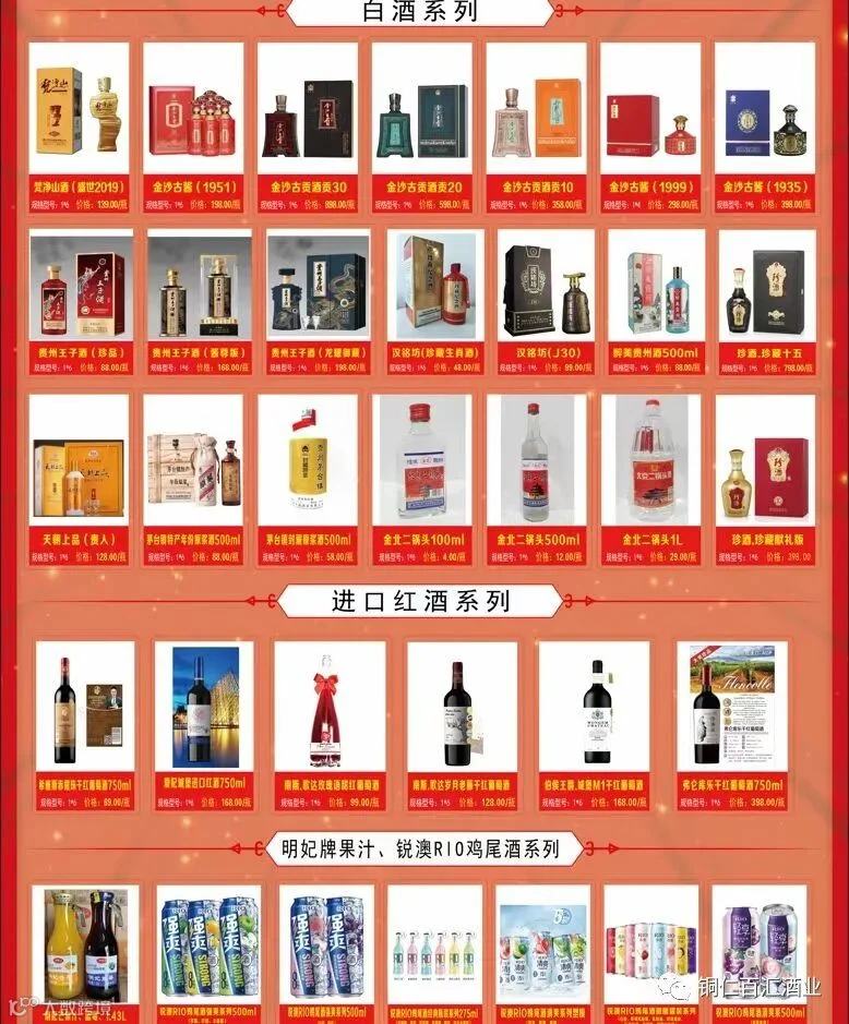 本公司代理经销:金沙古酒.古酱、古贡系列 ,长城干红;茅台干红,张裕干红;进口红酒;明妃牌果汁,锐澳R1O鸡尾酒,珍酒,梵净山酒,茅台镇系列白酒等各类名酒。批发兼零售,及宴席用酒配送,铜仁市内免费送货,欢迎大家咨询和下单!