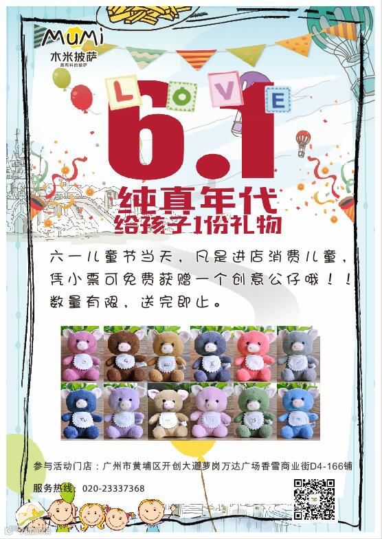 六一儿童节当天,凡是进店消费儿童,凭小票可免费获赠一个创意公仔哦!!数量有限,送完即止。