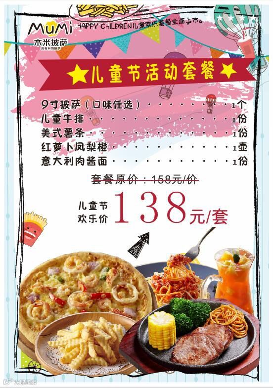 儿童牛排1份+9寸披萨1个(口味任选)+美式薯条1份+意大利肉酱面1份+红萝卜凤梨橙1壶