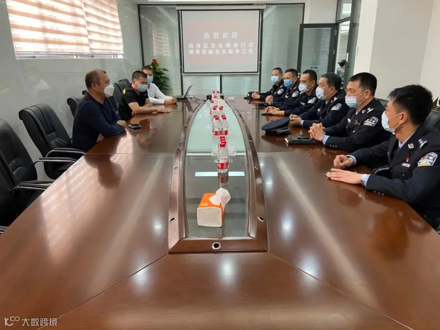 2月28日下午三点,南海公安局纪委书记许飞鹏、西樵派出所所长周湘辉、西樵派出所教导员白敬棠、西樵派出所主任伍谦文、民乐社区民警中队中队长梁宏峰等一行领导莅临名杰纺织召开“企业复工复产防疫工作指导座谈调研会”。