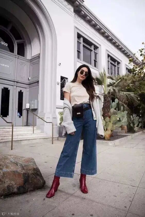对于有些腿型不是很好的女生就会很羡慕腿部笔直的女生,那么选择阔腿裤就能够很好的扬长避短。比如:T恤搭配牛仔阔腿裤是比较经典的搭配,完全看不出腿部有什么不足的地方。