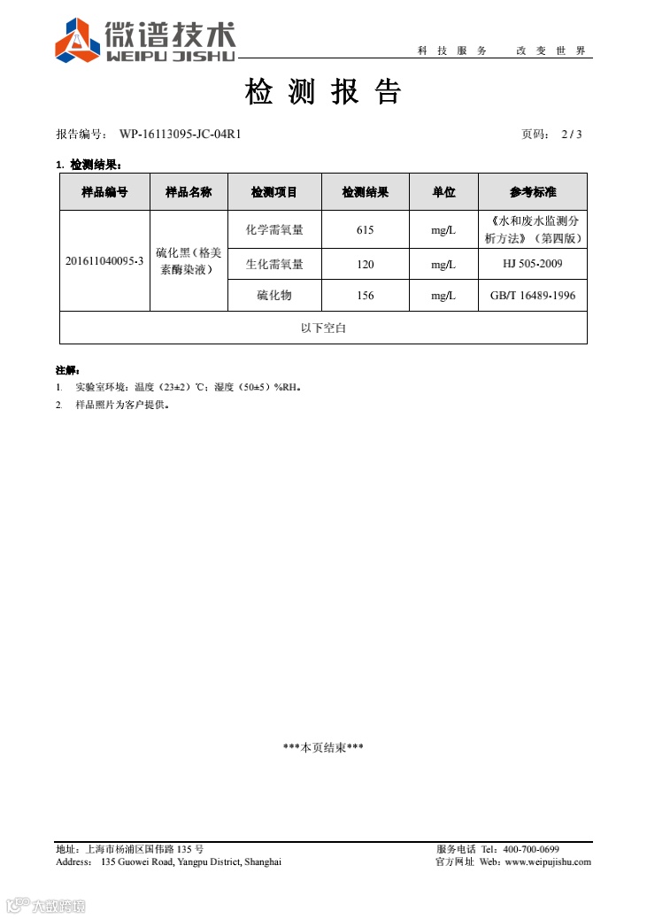 根据检测数据表明,使用环保硫化黑牛仔技术后,产生的污水COD(化学需氧量),比传统工艺下降了76%,污水硫化物含量降低74%,单机台废气中硫化氢减低72%,氨减低91%,污泥产生量降低20%,工厂周边“含硫的臭鸡蛋味”明显减弱,周边居民空气指数大大改善!