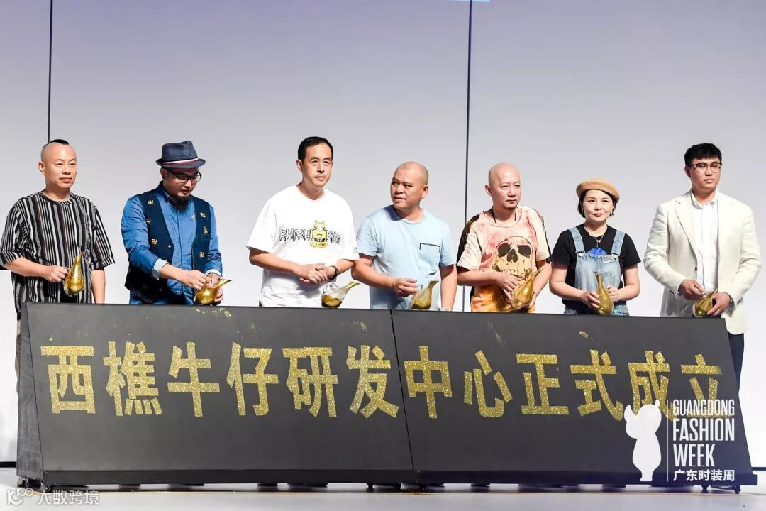 广东省服装服饰行业协会执行会长刘岳屏,佛山市黄氏投资集团有限公司副总经理黄永豪以及知名服装设计师邱伟、季青松、赵梦葳、李贵洲等共同手持金沙为“西樵牛仔研发中心”描金