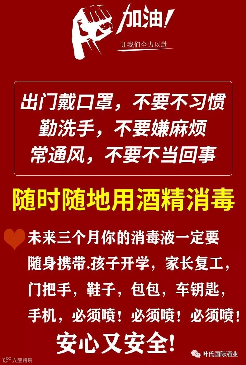 叶氏国际酒业始终牢记使命:疫情防控,人人有责。在这个病毒肆虐的特殊时刻,叶氏国际酒业力所能及地参与到这场无硝烟的病疫“战争”中来,希望通过实际行动尽一份企业责任,与全国人民一同打赢这场疫情攻坚战!