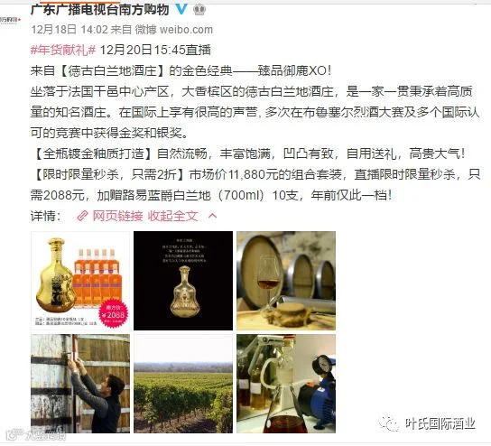 首次和南方家庭购物频道合作,叶氏国际酒业携热销产品(臻品御鹿XO5L和路易蓝爵白兰地700ml组合套装)亮相于购物频道,臻品御鹿XO是一个金葫芦陶瓷瓶,外观高贵典雅,大气上档次,其酒液入口顺滑、甘洌芳香、延绵悠长,是居家收藏、馈赠好友首选;而路易蓝爵白兰地更是受热棒产品,销售一直位居首列。这样的优惠组合套装刺激了观众的消费欲望,在电视广告播出之后,已经创造了丰厚的销售业绩。
