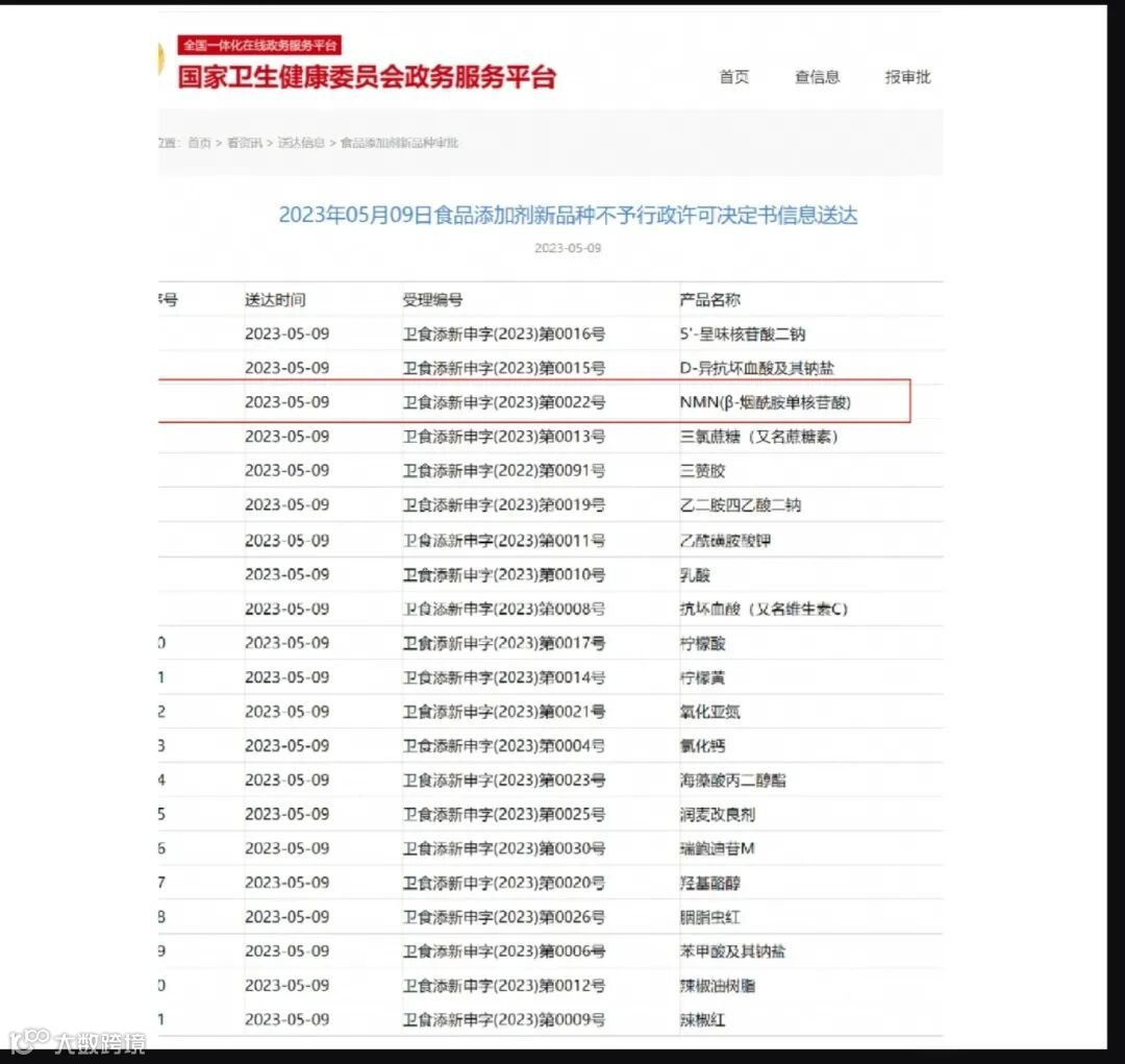 2023年5月,国家卫健委对NMN作为食品添加剂,不予行政许可。