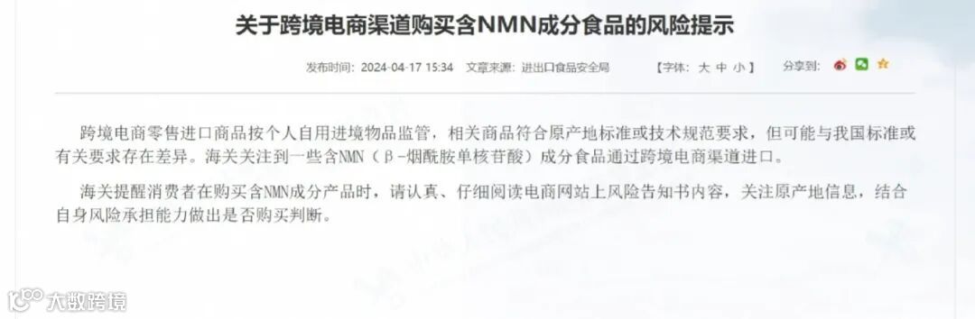 2024年4月,海关总署也对通过跨境渠道购买的NMN产品进行了风险提醒。