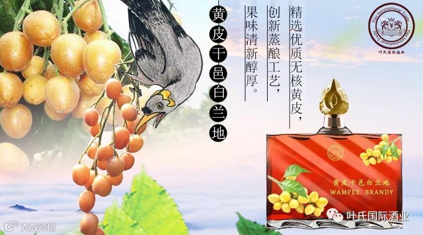 下图是叶氏国际酒业新品黄皮蒸馏干邑,让大家先睹一下其风采