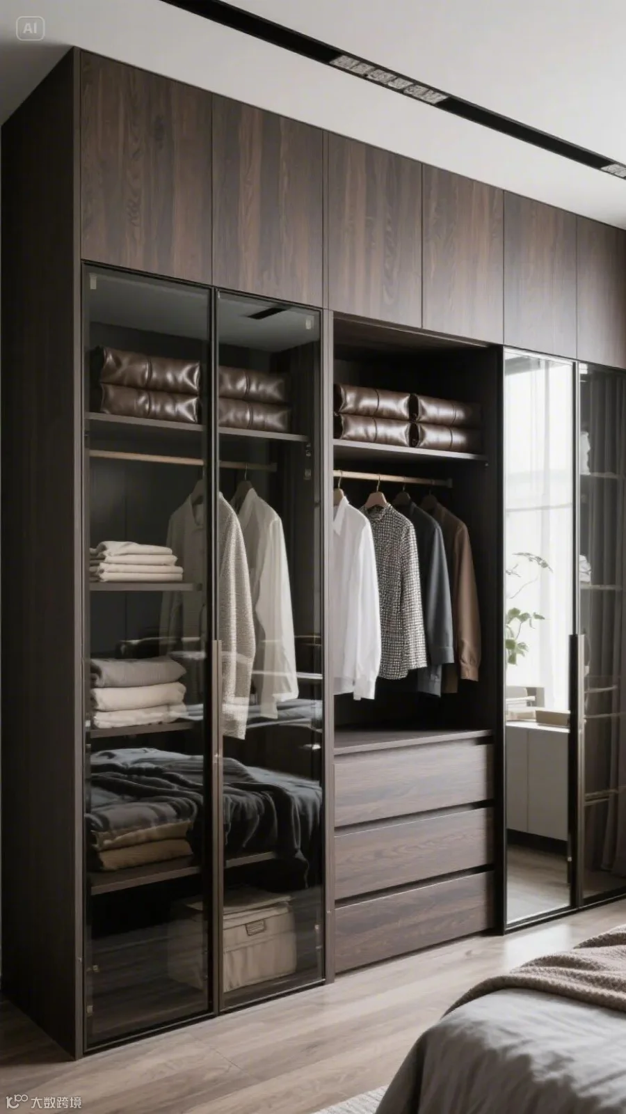 • 衣柜系统:R04染影生态板到顶,303皮纹开放格陈列衣物,镜面延伸视觉层次。