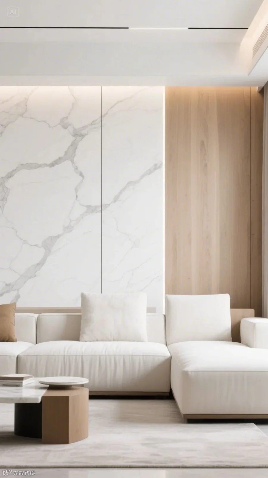 客厅沙发背景墙:大理白火烧木饰面+卡拉拉白大理石,直线切割工艺强化视觉张力。