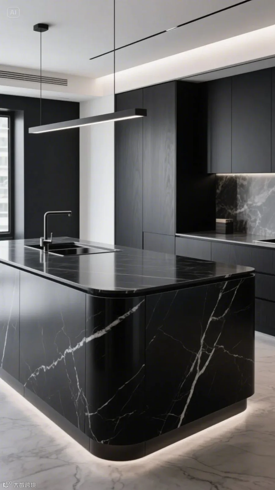 • 岛台台面:6138云石黑高光生态板,无缝拼接人造石,防污耐刮如佛罗伦萨大理石工坊。