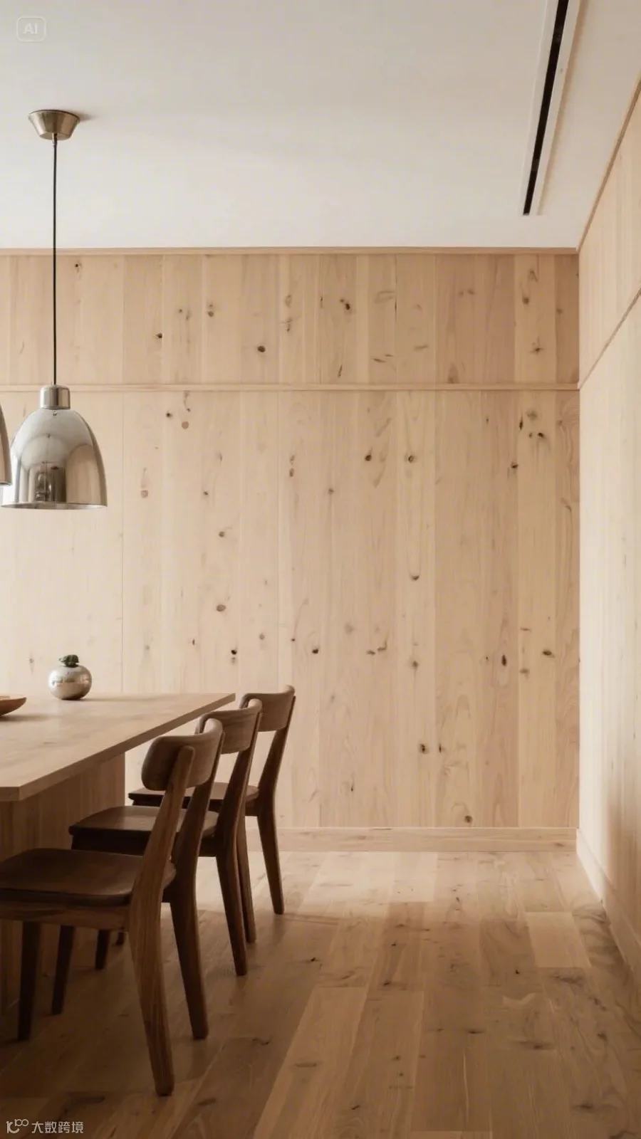 餐厅护墙板:全桦木地板延伸至墙面,温润质感中和金属灯具的冷峻。