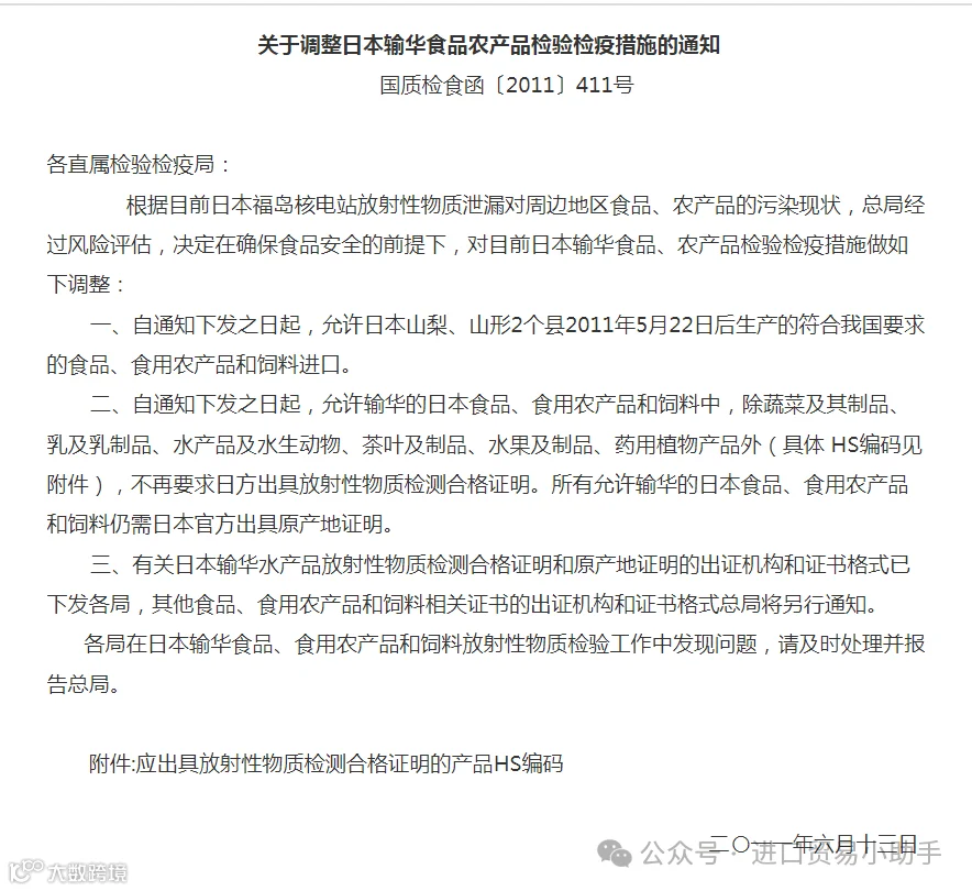 为全面防范日本福岛核污染水排海对食品安全造成的放射性污染风险,保护中国消费者健康,确保进口食品安全,依据《中华人民共和国食品安全法》及其实施条例、《中华人民共和国进出口食品安全管理办法》有关规定,以及世界贸易组织《实施卫生与植物卫生措施协定》有关规定,海关总署决定自2023年8月24日(含)起全面暂停进口原产地为日本的水产品(含食用水生动物)。其实早在2011年日本福岛核电站放射性物质泄漏后,我国对以下日本食品就要求提供放射性检测合格证明。