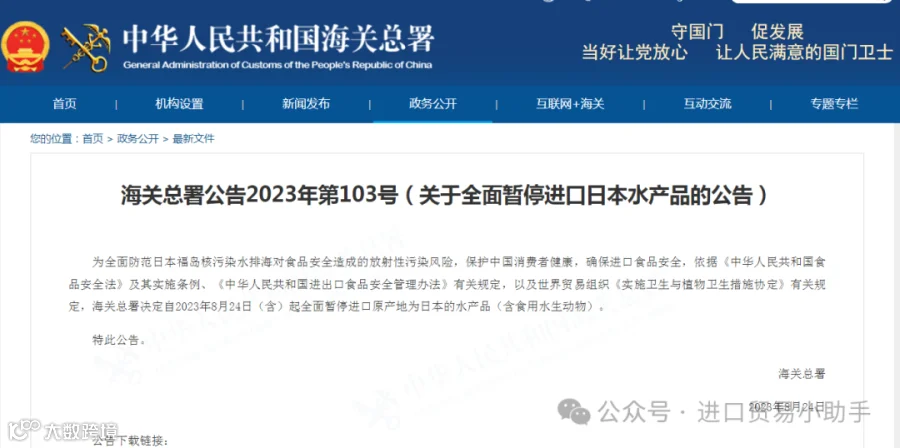 海关总署公告2023年第103号(关于全面暂停进口日本水产品的公告)