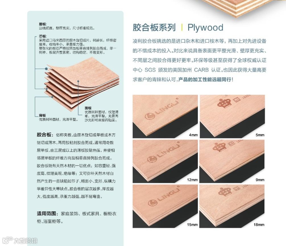 凌利胶合板选用进口杂木和进口桉木,表面更平整光滑、壁厚也更充实,同时拥有重量轻、纹路清晰、绝缘、强度大,且不易变形的特点,是家庭装修优质的选择之一。