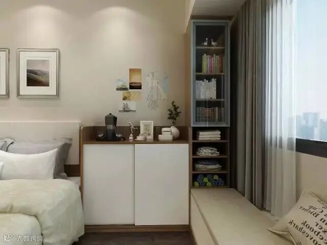 床头柜设计也采用了导角,可以放置一些随手使用的物品,一边设计的读书角,也给卧室带上了一丝文艺气息。