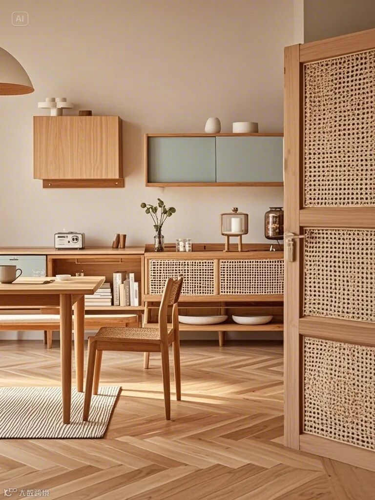 软装公式:原木色地板+莫兰迪色柜体+藤编元素