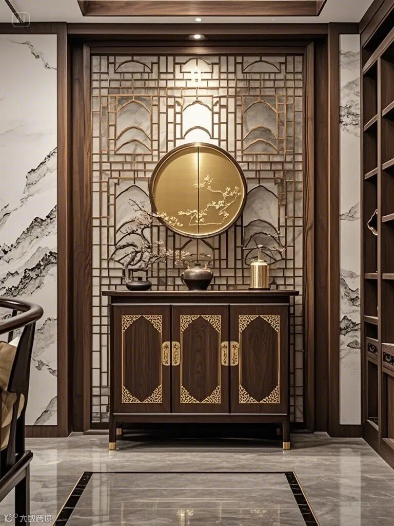 施工要点:独创3D雕刻技术还原传统榫卯纹样,建议墙面留缝8-10mm增强立体感。玄关处的回形纹护墙板与黄铜元素碰撞,诠释现代东方美学。