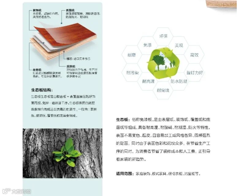 生态板是新一代的环保材料,在材质上,生态板的板芯以实木为基材,相比刨花板,密度板,实木打造的生态板防潮性更好,稳定性强,而且生态板表面有一层三聚氰胺饰面纸,起到防褪色的作用,在制作成成品以后,不需要涂漆,避免了有害气体对人体的危害,给人们一个环保健康的生活环境。