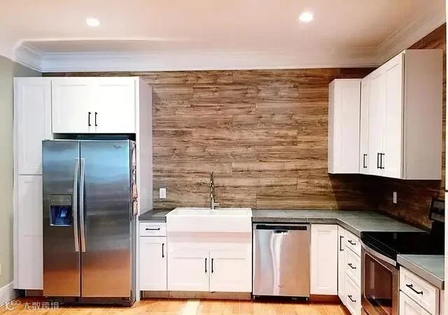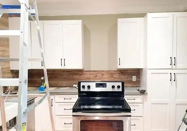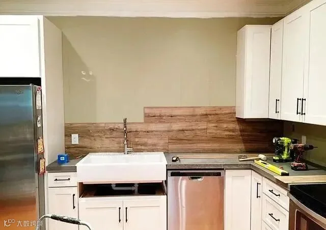 按照前面的手法,一点点的铺满整个厨房的墙面。合计花费了60美元(423元),当然时除去吊柜的面积。