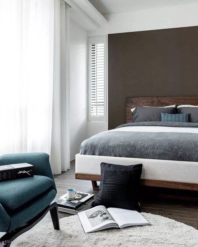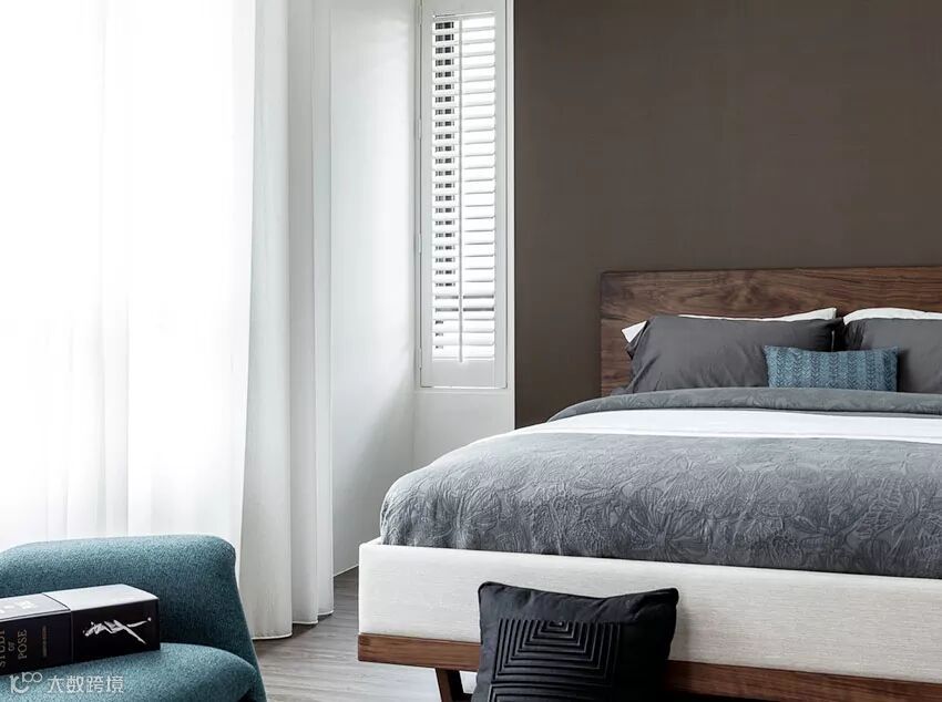 视觉宽敞不压抑,床头使用深色壁纸,营造沉稳宁静、容易入睡的氛围。