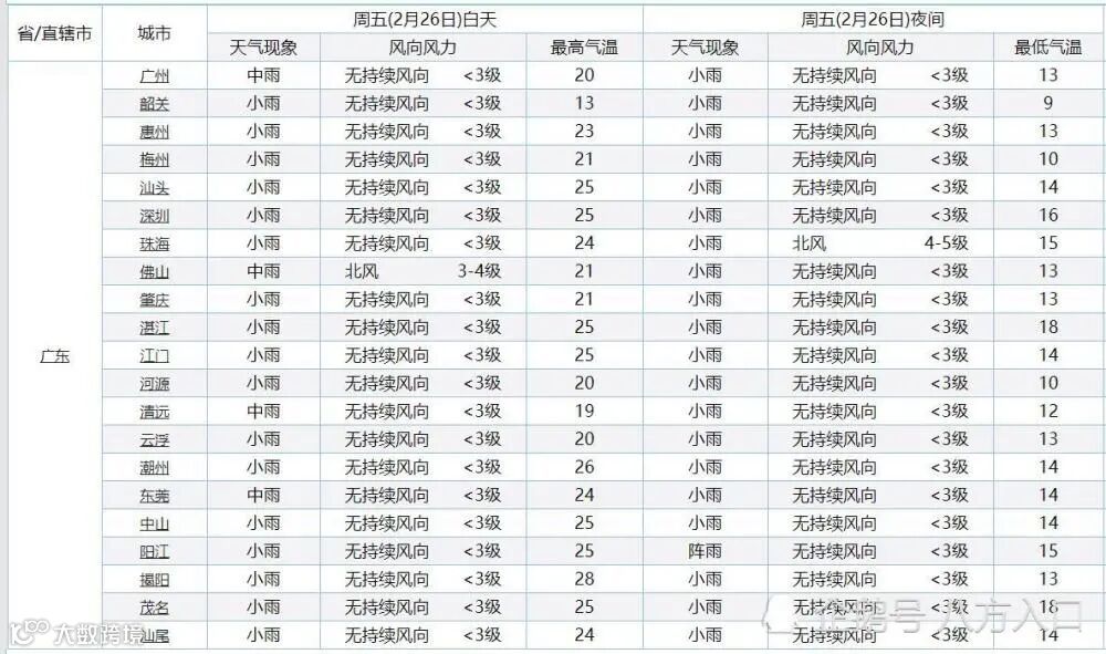 今天广东主要城市中,广州,佛山,清远,东莞等地预报有中雨转小雨,其余各地的降雨主要是以小雨或阵雨为主。在气温方面值得注意的是,今天韶关,清远的最高气温跌破20度,其中韶关的最高气温将降至13度。