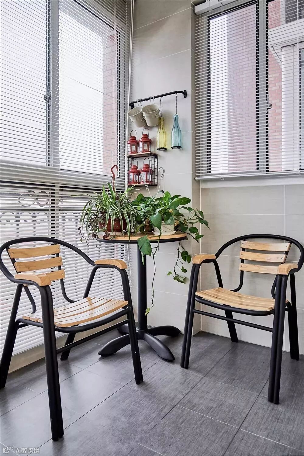 阳台的一侧摆放了休闲桌椅,墙面挂一些零碎小物,非常有格调。