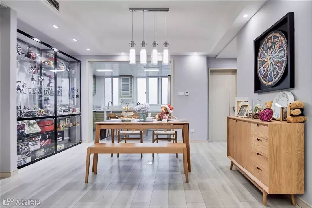 餐厅布置在屋子中央,4周留出足够的活动空间;一边是以玻璃橱柜收纳男主人的各种手办,另一边是餐桌椅同款边柜。
