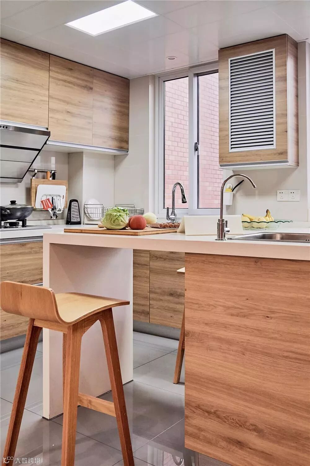 厨房是开放式的岛台造型,与其他空间有了更多联系,原木橱柜+米色墙砖,明亮又温馨。