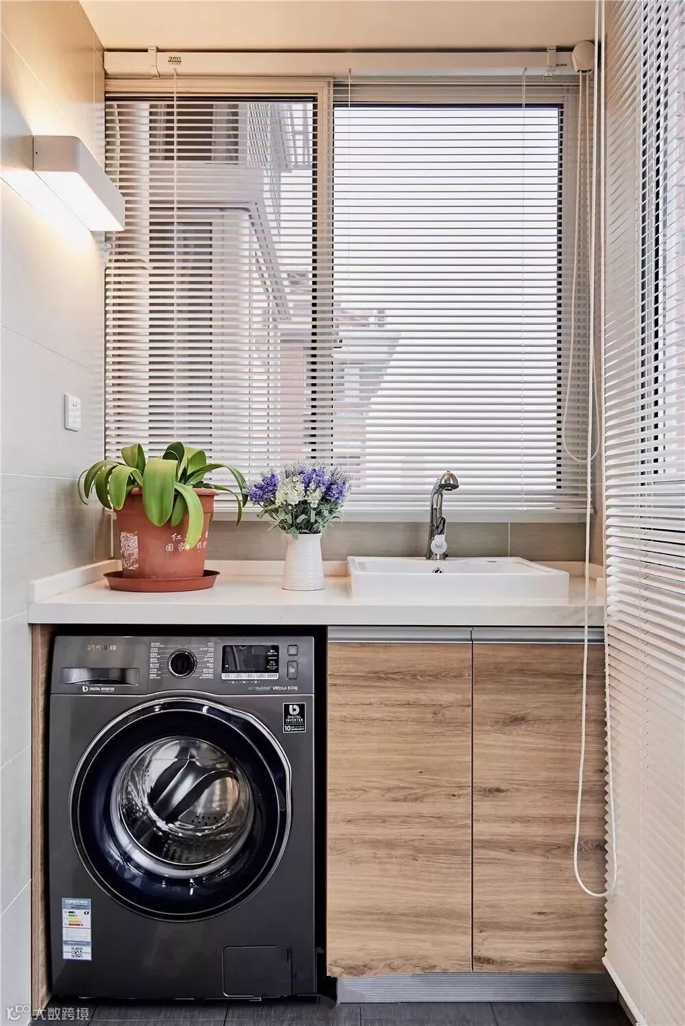 另一侧是常规的洗衣台,百叶帘防晒,也让阳光变得更加柔和舒适。
