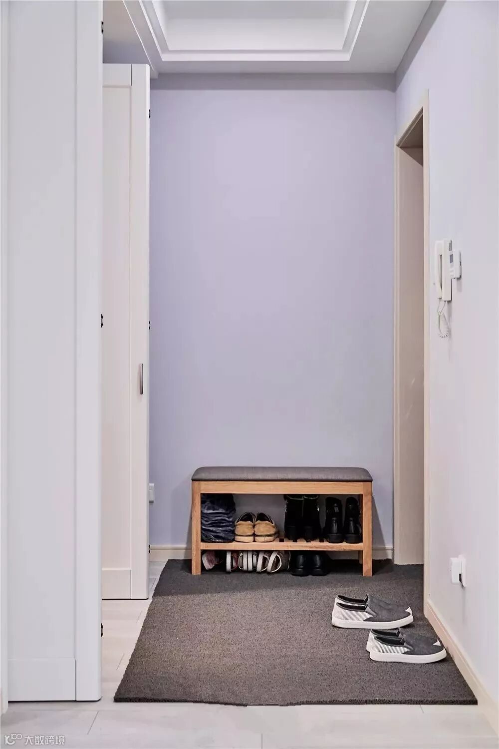 入户玄关走廊处摆放了自带收纳的换鞋凳,深色地毯布置落尘区,把屋外的灰尘、杂物不带入屋里。