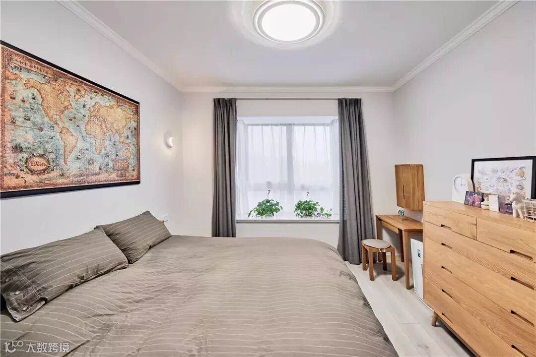 原木家具+复古床头画与客厅呼应,床尾长斗柜和梳妆台,补充卧室收纳和梳妆功能。
