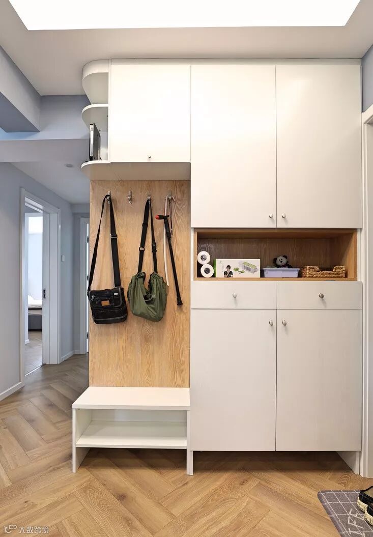 上面储物,中间挂衣帽包包,鞋凳的下面还可以收纳鞋子。开放式虽然功能更加全面,但是因为没有柜门遮挡,然后又是在玄关这样进门就可以看到的地方,建议不要放得太满,会显得杂乱,不太好看。