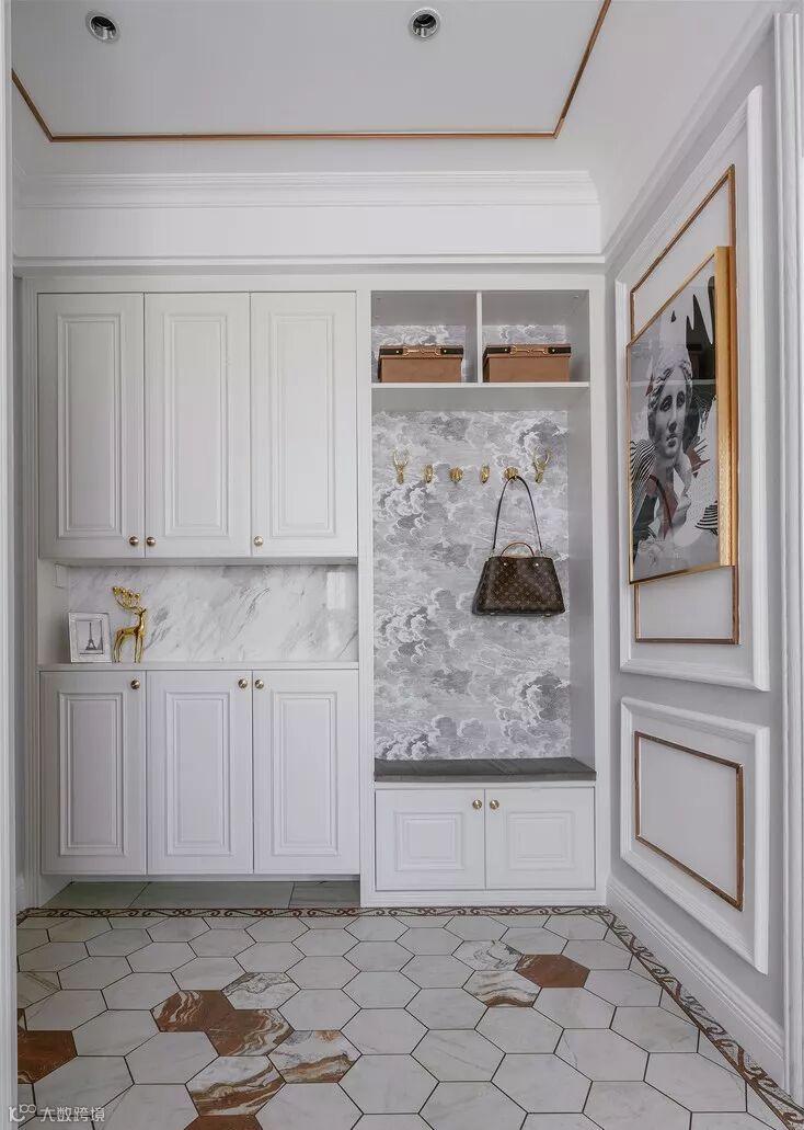 嵌入式鞋柜一般是和进门吊顶结合设计的,不仅美观实用而且可以大大节省室内空间。利用墙面的空间,在考虑墙体的承重范围下,在玄关处设计嵌入式鞋柜,能够保证鞋柜足够安全。